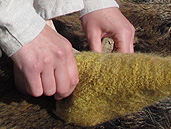 Low woollen sprang socks have been dyed using onion skins to show yellow through the pieced soft footwear.