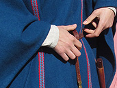 The woollen outer tunic has very wide sleeves with decoration from hem to hem across the shoulders. This can be seen on various wall paintings from Christian catacombs. Outer tunics from the Cemetery of Priscilla and the Cemetery of Traso show strips with a decorative pattern. A mosaic from Piazza Armerina Villa shows the mistress of the house and her two female attendants with very wide sleeves, often held close to the body by the belt to make working easier. It is likely that the rich had no need for a girdle to hold their sleeves out of the way. But with two tunics a belt or girdle was more likely to be worn, normally under the bust above the waist.