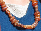 The necklace is made up of carnelian beads, derived from the Latin caro, carnis meaning flesh, in reference to the flesh colour sometimes exhibited.