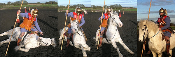 But my favourite method is just to get the horse to lie down. It is easier to teach the horse to lie down than to kneel. Just step over the horse and encourage him up using the reins. During a public show the crowd will think this is very impressive, and it allows the rider to wear lots of heavy restrictive armour and still get on the horse. As the horse rises, the rider throws his weight forward as with jumping, and can steady himself with the spear.