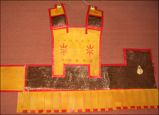 I did not want the scales sewn directly to the leather, since piercing the leather could weaken it. Instead nearly 2000 scales were wired to each other and stitched to linen, with another sheet of linen applied over the first to cover the stitching and wire. The scales were attached tightly to the linen, far more tightly than on my Roman armours, meaning they were less susceptible to upward strikes. But the design retained its innate flexibility. The linen and scales were then stitched to the top and sides of the yoke. The tube was edged in goatskin inked in red. Indeed red ink was used to decorate the whole armour. The resulting tube was heavy, but very, very strong.