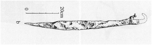 These also change through time, generally moving from an antennae hilt and long thin blade to a shorter weapon. The long sword in the middle dates to around the 6th-5th centuries BC, weighs just 410g and is 64cm long with a 50cm blade.