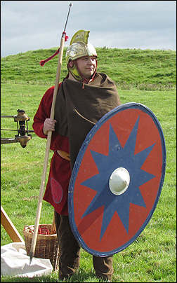 The various types of javelin are used at around 20m. This is often very competitive, and weapons need to be sharp to penetrate the target and stay there. The iron components of these weapons can be bought within the group, and they are massively cheap compared to re-enactor traders. Throw using a shield in your left hand, and go for speed of throwing as well as for accuracy. The spiculum makes a good weapon to carry when drilling, and a fun weapon to use on the range. The head and ferrule cost around £21, and the whole thing is a bargain.
