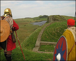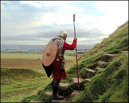 It is important to get an early start, and there was general reluctance to get up in the morning. It took a little cajoling to get everybody ready to start. We climbed up to the Wall, took a chance to redistribute the straps of our equipment, and headed west to try and fit in as many archaeological hot spots as possible. The wind was biting but a helmet and scale armour stops wind chill nicely. Sharon did a great job of both keeping young Alan entertained, and driving to meet us at different spots to help hand out water and take unwanted bags etc.