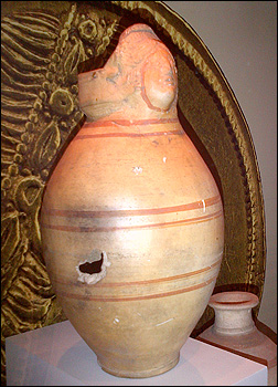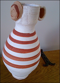 Comitatus portrays 4th century Romans from the north of Britain. This area was dominated by the Crambeck pottery industry which started in the late third century. But perhaps because of increased demand due to the re-organisation of the northern defences of the province under Theodosius, and perhaps some administrative intervention such as the award of an army contract, the pottery captured virtually the whole of the market in the last thirty years of the fourth century.It was close to both Malton and York and the river Derwent provided good transport links. Both Oxford clay and boulder clay were used in combination to produce various types of pottery, amongst which crude mask-mouthed flagons were a very small part. But I was lucky enough to buy a reproduced example from Graham Taylor from Potted History, www.pottedhistory.co.uk and became very interested in tracking them down.